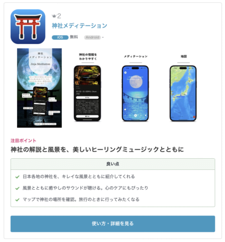 日本全国各地の美しい神社と音楽で瞑想をするアプリです。