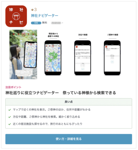神社の詳細情報も収録し、マップや経路案内可能